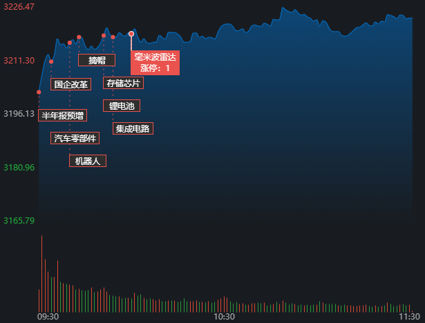 7月13日早盤,A股三大指數(shù)震蕩回升,呈深強滬弱格局。截至上午11:30,上證指數(shù)漲0.86%,報3223.49點,深證成指和創(chuàng)業(yè)板指漲幅分別為1.13%和1.41%;滬深兩市成交額合計5529.2億元,較上一交易日同期增長2.46%。A股市場有3441只個股上漲,1552只下跌,漲跌停方面,有27只個股漲停,跌停股8只。