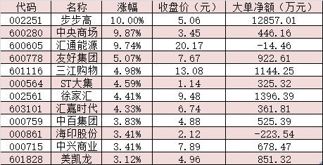 7月18日,零售板塊集體異動,截至收盤,板塊整體上漲1.59%,跑贏上證指數(shù)(跌0.37%)。其中,中央商場已連收3個漲停板,步步高也以漲停報收,匯通能源、友好集團分別大漲9.74%、5.07%。
