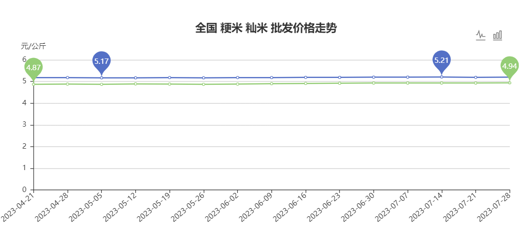 國內(nèi)方面,大米價(jià)格顯示出波瀾不驚的氣度。8月7日,國家商務(wù)部發(fā)布的全國粳米批發(fā)價(jià)格均在7元/公斤以下,山東淄博、深圳福田等地批發(fā)市場價(jià)格低于6元/公斤,全國均價(jià)約在5.2元/公斤左右,上下波動(dòng)僅為0.04元/公斤。秈米批發(fā)價(jià)格均在7元/公斤以下,河南信陽、四川成都、海南等地批發(fā)市場價(jià)格低于5元/公斤,全國均價(jià)約在4.94元/公斤左右,上下波動(dòng)僅為0.07元/公斤。
