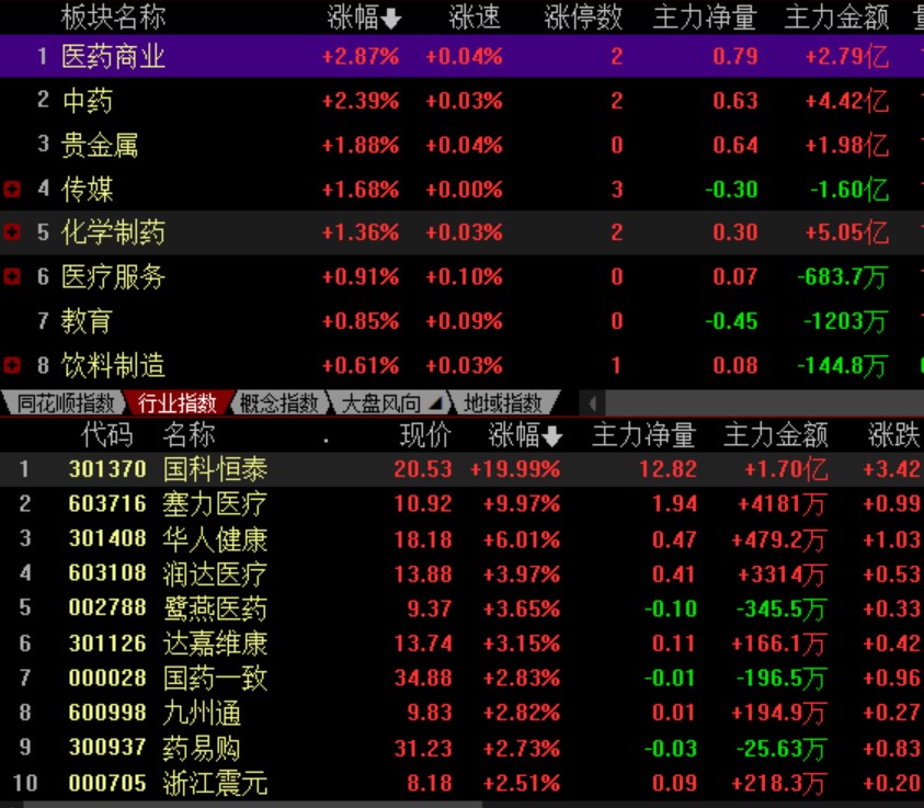 具體看,截至8月8日上午收盤(pán),醫(yī)藥商業(yè)板塊表現(xiàn)出色,漲幅達(dá)2.87%。其中,國(guó)科恒泰和塞力醫(yī)療強(qiáng)勢(shì)漲停。