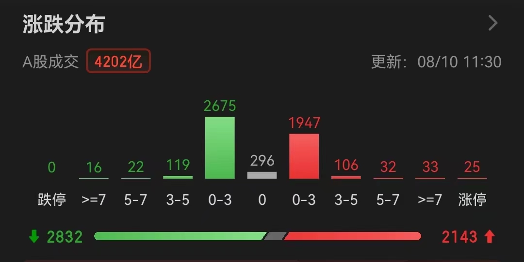 周四(8月10日),三大股指繼續(xù)震蕩整理。截至上午收盤,上證指數(shù)跌0.26%,報3235.90點;深證成指跌0.54%,創(chuàng)業(yè)板指跌0.28%;滬深兩市合計成交額4201.77億元,總體來看,兩市個股跌多漲少。