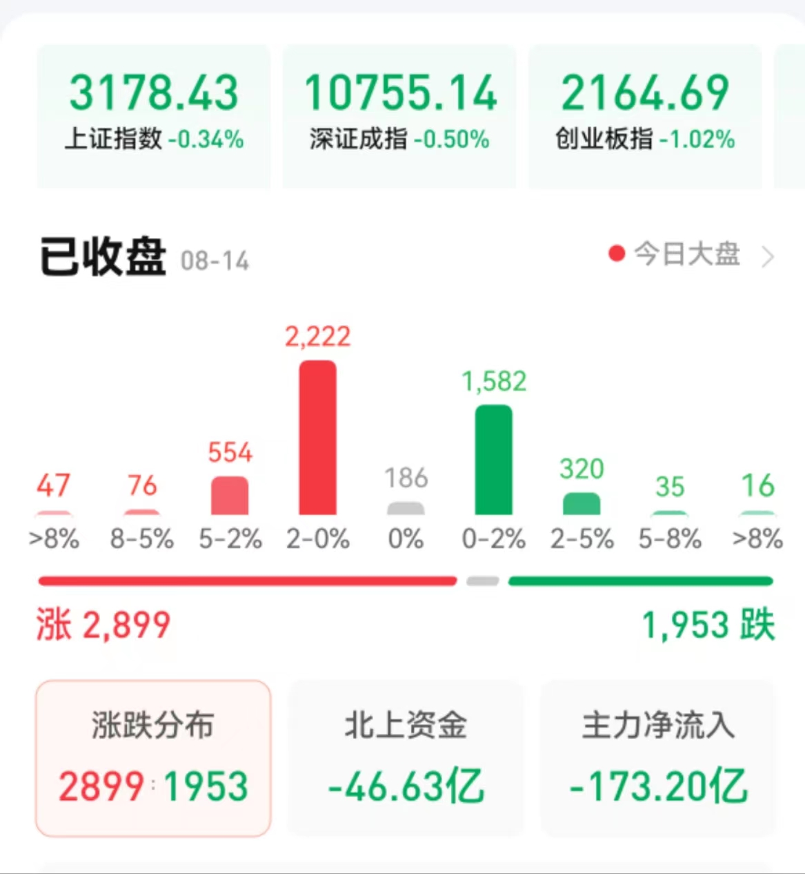 周一(8月14日),A股三大股指震蕩下行,全線飄綠。截至收盤,上證指數(shù)跌0.34%報3178.43點,深證成指跌0.50%報10755.14點,創(chuàng)業(yè)板指跌1.02%報2164.69點;兩市合計成交金額達7419.61億元??傮w上看,兩市個股漲多跌少。其中,漲停個股達36只,跌停個股達7只。