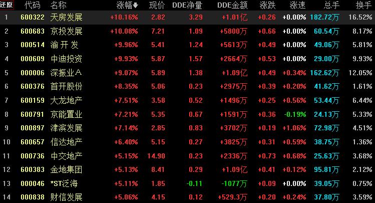 具體看,截至8月16日上午收盤(pán),房地產(chǎn)開(kāi)發(fā)板塊漲幅居首,達(dá)3.22%,資金凈流入92.37億元。其中,天房發(fā)展、京投發(fā)展、渝開(kāi)發(fā)、中迪投資等個(gè)股紛紛漲停。