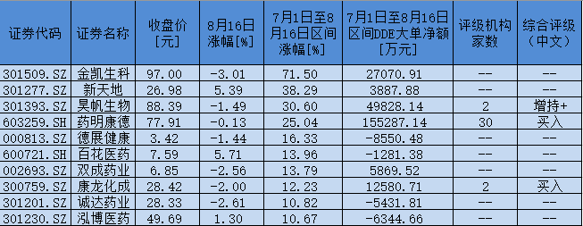 表:7月1日至8月16日,CRO概念板塊區(qū)間漲幅超10%個股一覽