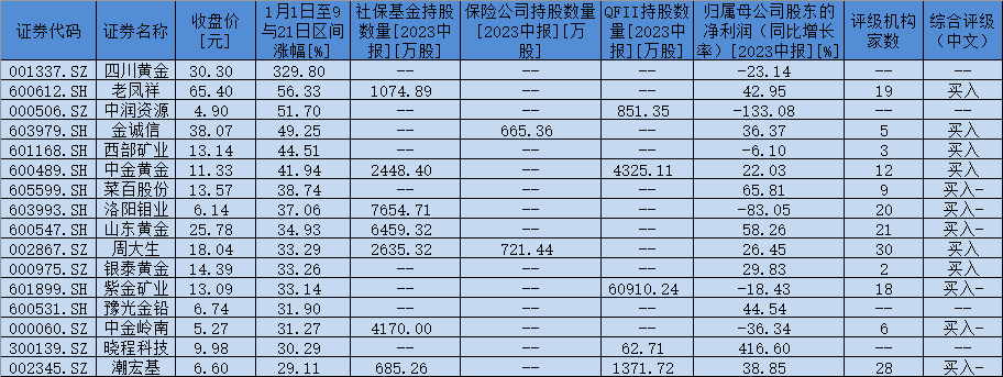 表:2023年1月1日至9月21日,同花順黃金概念板塊漲幅超20%個(gè)股一覽