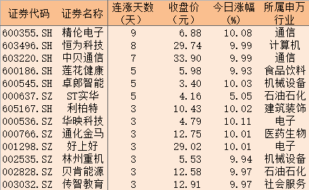表:今日以漲停價(jià)報(bào)收且連續(xù)上漲3日以上的個(gè)股一覽