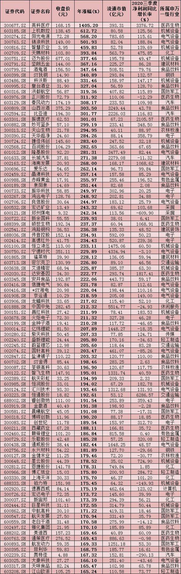從個股方面來看,2020年的個股表現(xiàn)較為喜人?!蹲C券日報》記者根據(jù)同花順統(tǒng)計發(fā)現(xiàn),剔除去年上市的次新股,2020年滬深兩市共有2004只個股實現(xiàn)上漲,占可交易個股總數(shù)的53.74%。其中,有255只個股累計年漲幅超過100%,股價實現(xiàn)翻番。值得關(guān)注的是,英科醫(yī)療以年內(nèi)漲幅1405.2%,位居2020年漲幅榜首位,同時也是2020年漲幅唯一超過1000%的股票。