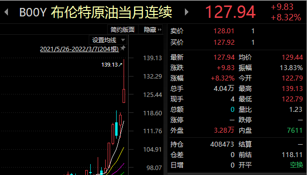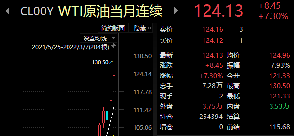 北京時(shí)間3月7日,美、布原油期貨再次迎來大漲。其中,布倫特原油一度漲逾10%,升至139.13美元/桶,而WTI原油期貨則突破130美元/桶。截至11點(diǎn)12分記者發(fā)稿,布倫特原油和WTI原油分別報(bào)128.77美元/桶、124.40美元/桶,今年以來累計(jì)漲幅均超65%。