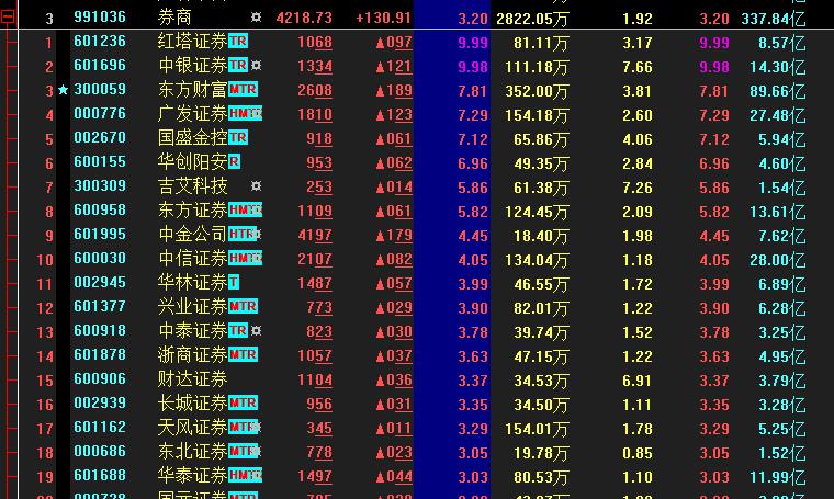 周三,作為行情風(fēng)向標(biāo)之一的券商板塊全線上漲,截至收盤,板塊漲幅達(dá)3.2%,其中,紅塔證券、中銀證券報(bào)收于漲停。