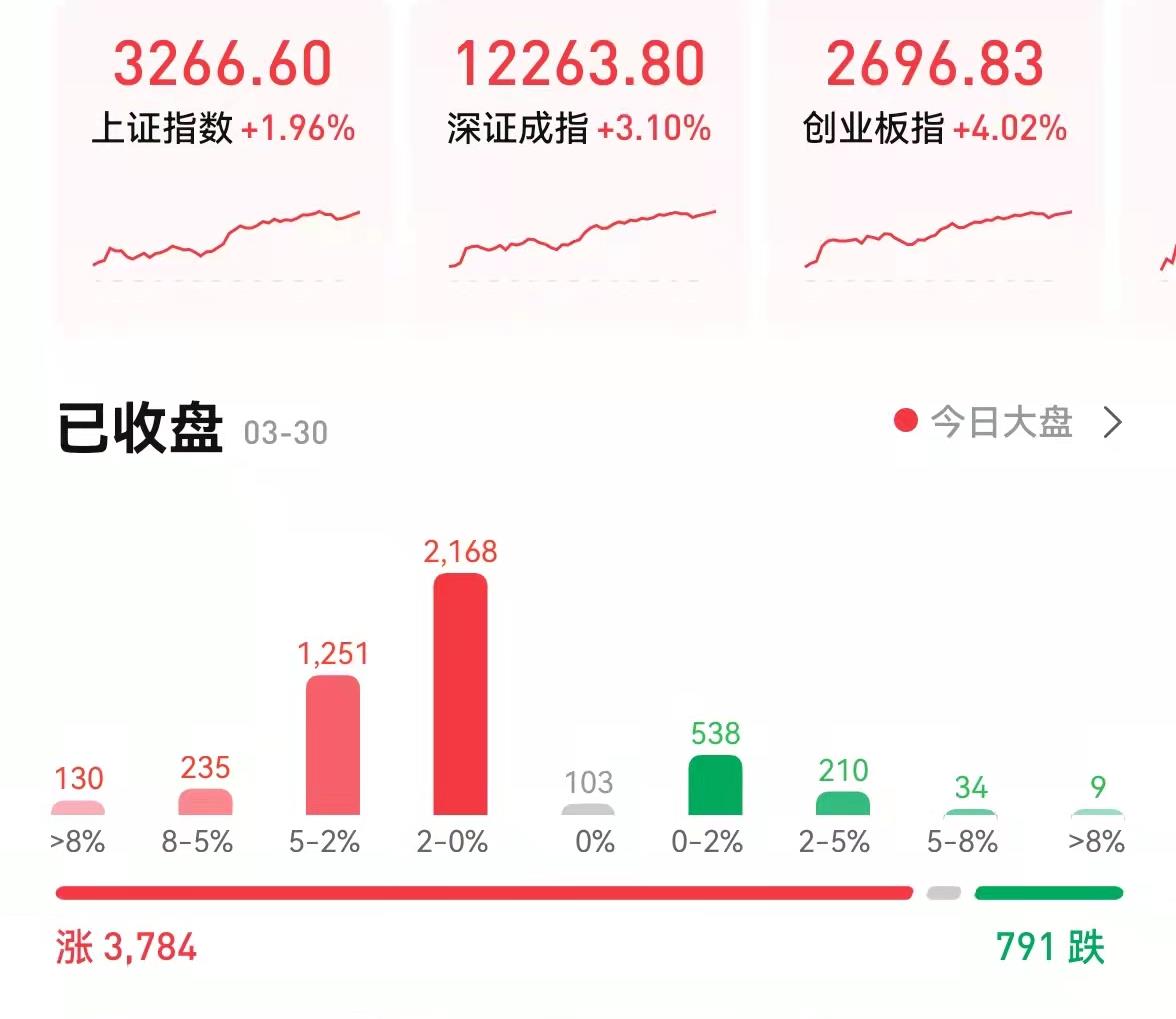 量價(jià)齊升!周三(3月30日),A股三大指數(shù)全線飄紅,創(chuàng)業(yè)板指飆升逾4%,量能有所放大,個(gè)股普漲。熱點(diǎn)方面,作為行情風(fēng)向標(biāo)之一的券商股爆發(fā),地產(chǎn)板塊繼續(xù)上漲,25只地產(chǎn)股集體漲停,備受矚目。與此同時(shí),北上資金大幅涌入超120億元,A股的反彈之路如何走?走多遠(yuǎn)呢?