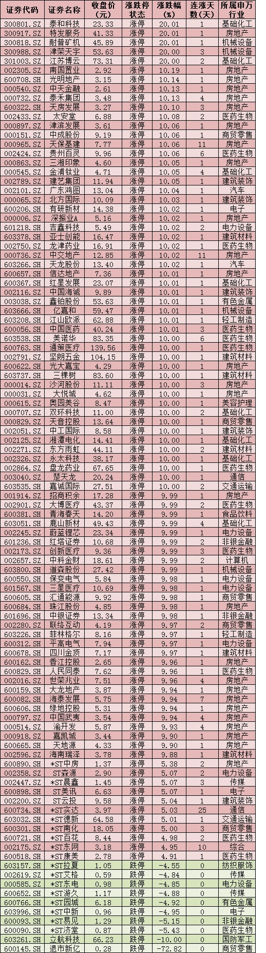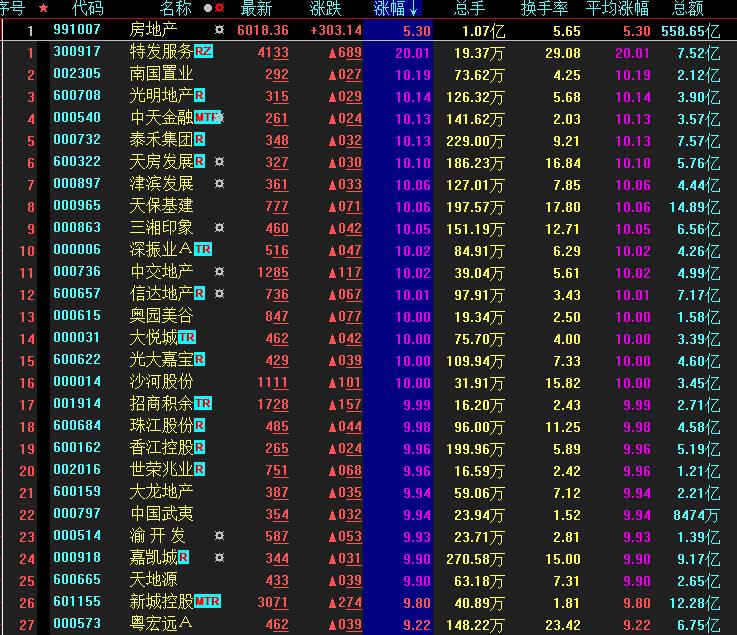 周三,房地產(chǎn)板塊表現(xiàn)搶眼,再度上漲,位居漲幅榜首位,達(dá)5.3%。25只地產(chǎn)股集體漲停,特發(fā)服務(wù)20COM漲停,天?;?4天11板。