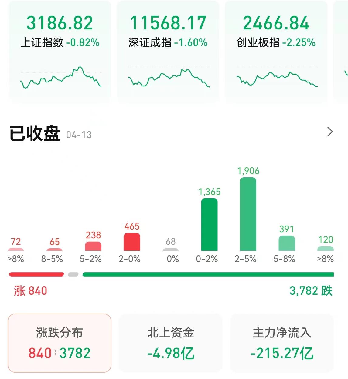 4月13日,A股三大指數(shù)呈現(xiàn)震蕩回落態(tài)勢(shì)。截至收盤(pán),上證指數(shù)跌0.82%報(bào)3186.82點(diǎn),深證成指跌1.6%報(bào)11568.17點(diǎn),創(chuàng)業(yè)板指跌2.25%報(bào)2466.84點(diǎn);兩市合計(jì)成交8734億元,北向資金凈賣(mài)出4.98億元。