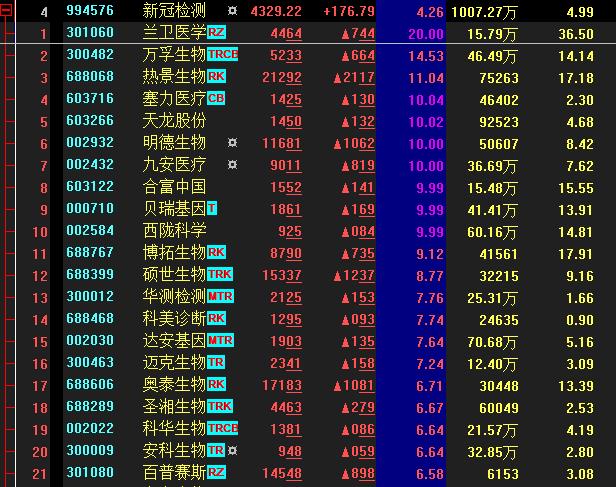 熱點(diǎn)二:新冠檢測板塊漲逾4% 蘭衛(wèi)醫(yī)學(xué)20CM漲停