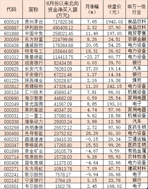 表:6月份以來受到北向資金青睞的個(gè)股