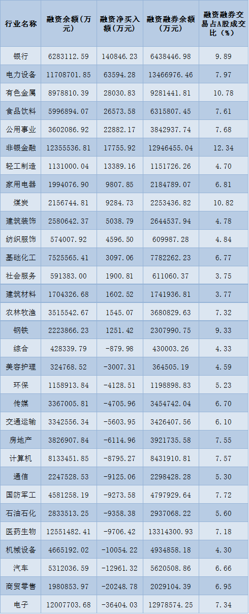 表:7月14日申萬一級(jí)行業(yè)兩融交易情況:
