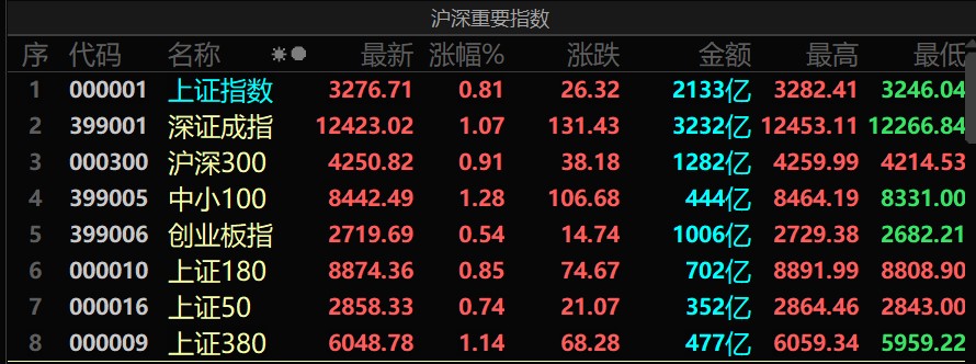 周二(7月26日),A股三大指數(shù)震蕩走強,集體上漲。截至上午收盤,上證指數(shù)漲0.81%,深證成指漲1.07%,創(chuàng)業(yè)板指漲0.54%;滬深兩市合計成交額5365億元,總體來看,兩市個股漲多跌少。