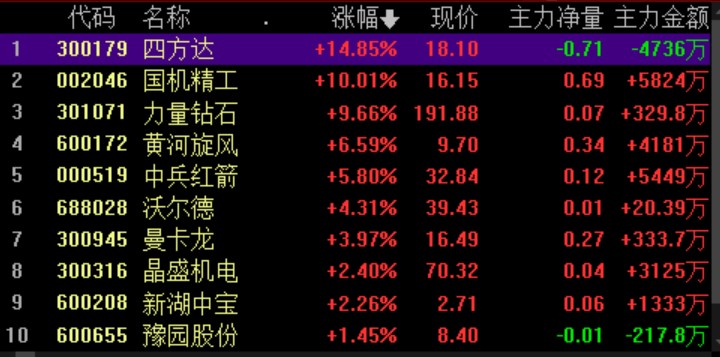 具體來看,同花順數(shù)據(jù)顯示,7月26日上午,培育鉆石板塊領(lǐng)漲,整體漲5.61%,板塊內(nèi)個股全部實現(xiàn)上漲,其中,國機精工強勢漲停,四方達漲超14%。