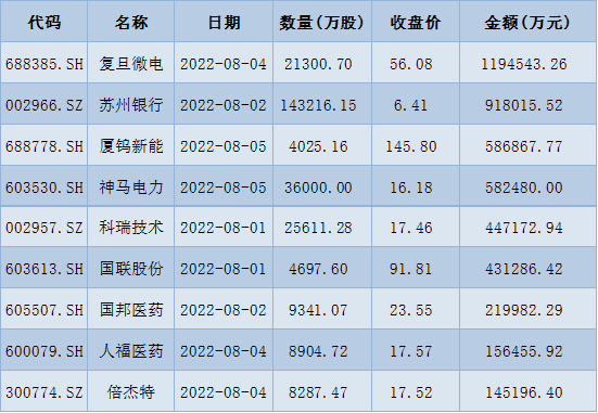 從解禁看,下周將有40只股票面臨限售股解禁,合計(jì)解禁量為33.01億股;按最新收盤價(jià)計(jì)算,合計(jì)解禁市值為556.09億元。從解禁股情況來看,復(fù)旦微電解禁金額最高,達(dá)119.45億元。