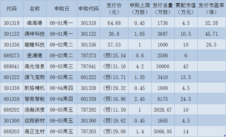 新股方面,根據(jù)發(fā)行安排,A股市場下周(8月日-8月5日)將有11只新股申購。