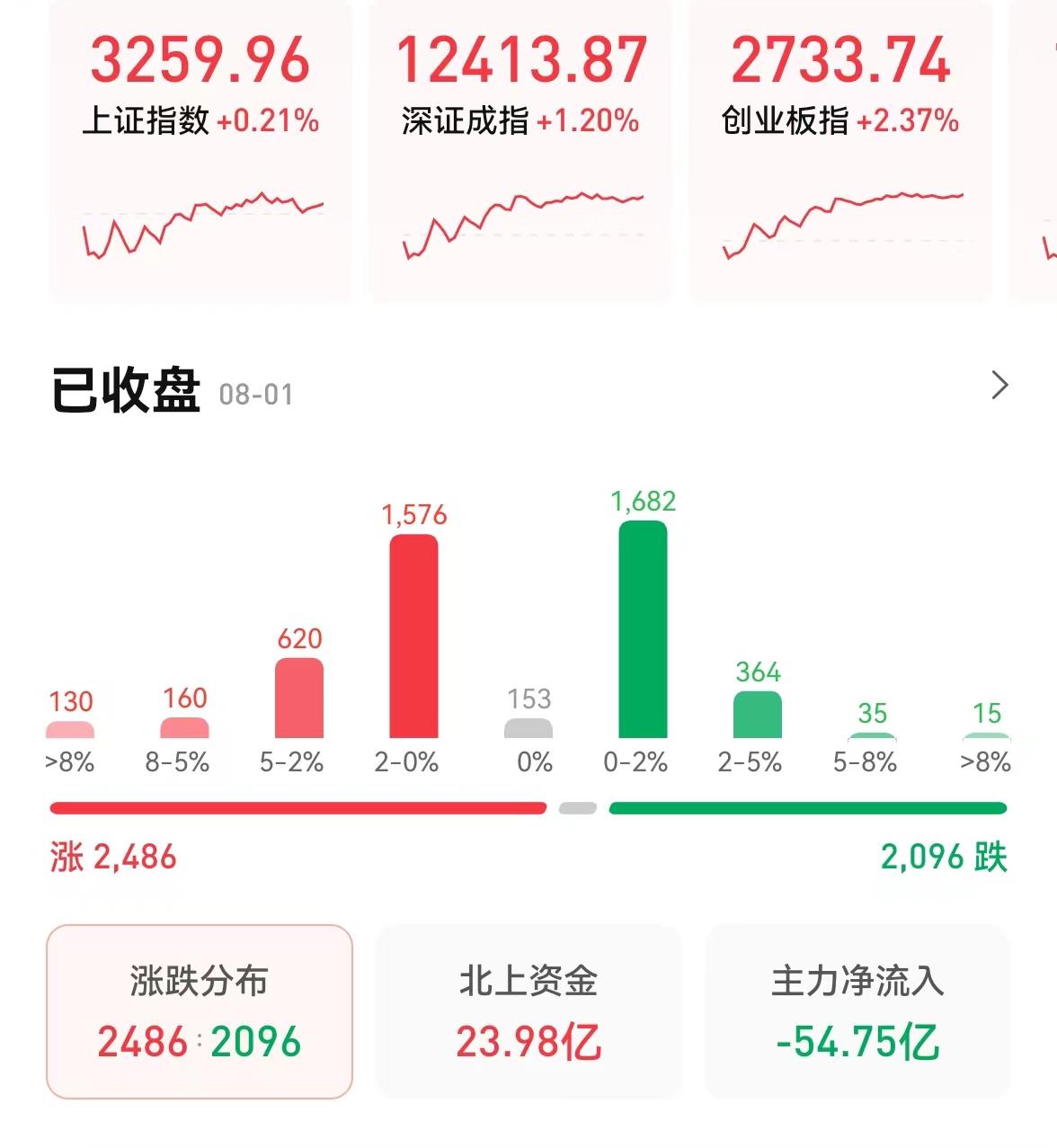 截至8月1日收盤,上證指數(shù)漲0.21%報3259.96點,深證成指漲1.2%報12413.87點,創(chuàng)業(yè)板指漲幅達2.37%報2733.74點;兩市合計成交9939億元,北向資金凈買入23.98億元。總體來看,A股個股漲多跌少。