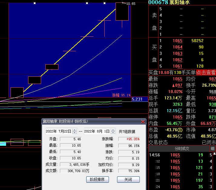 8月1日,熱門股襄陽軸承再度漲停,截至收盤,報10.65元,實現(xiàn)7連板累計漲幅達95.05%。