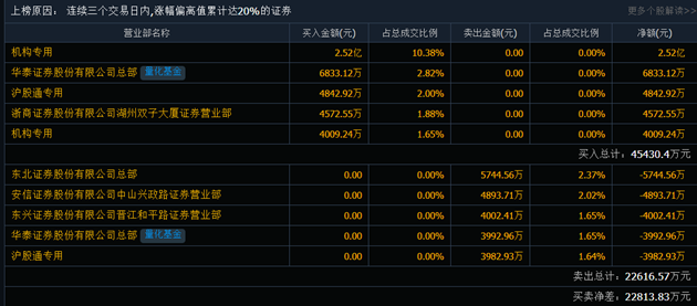 鳴志電器8月2日登上龍虎榜,同花順數(shù)據(jù)顯示,機(jī)構(gòu)專用賬號(hào)買入25172.57萬元,該賬號(hào)買入后,次日上漲概率50%,平均盈利0.42%。收益率最高的是持股1天后賣出,收益率0.42%,成功率50%。華泰證券股份有限公司總部買入6833.12萬元,該營(yíng)業(yè)部買入后,次日上漲概率46%,平均盈利-0.02%。收益率最高的是持股1天后賣出,收益率-0.02%,成功率46%。