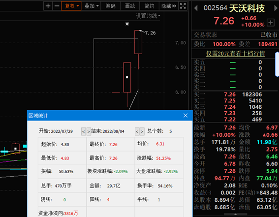 8月4日,天沃科技漲10.00%,報7.26元。該股自7月29日以來,截至8月4日已連續(xù)5個交易日上漲,累計漲幅達51.25%,最近的4個交易日實現(xiàn)連續(xù)漲停。