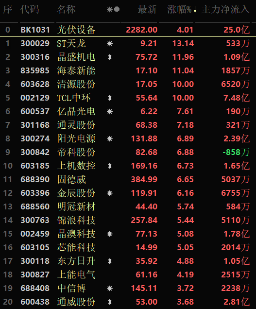 從漲幅居首的光伏設(shè)備件行業(yè)看,截至8月15日11:30,行業(yè)交易中的46只個股,有43只上漲,其中,有2只個股漲停。從資金流向看,光伏設(shè)備行業(yè)今天上午大單資金凈流入額達(dá)25億元,居行業(yè)第1位。