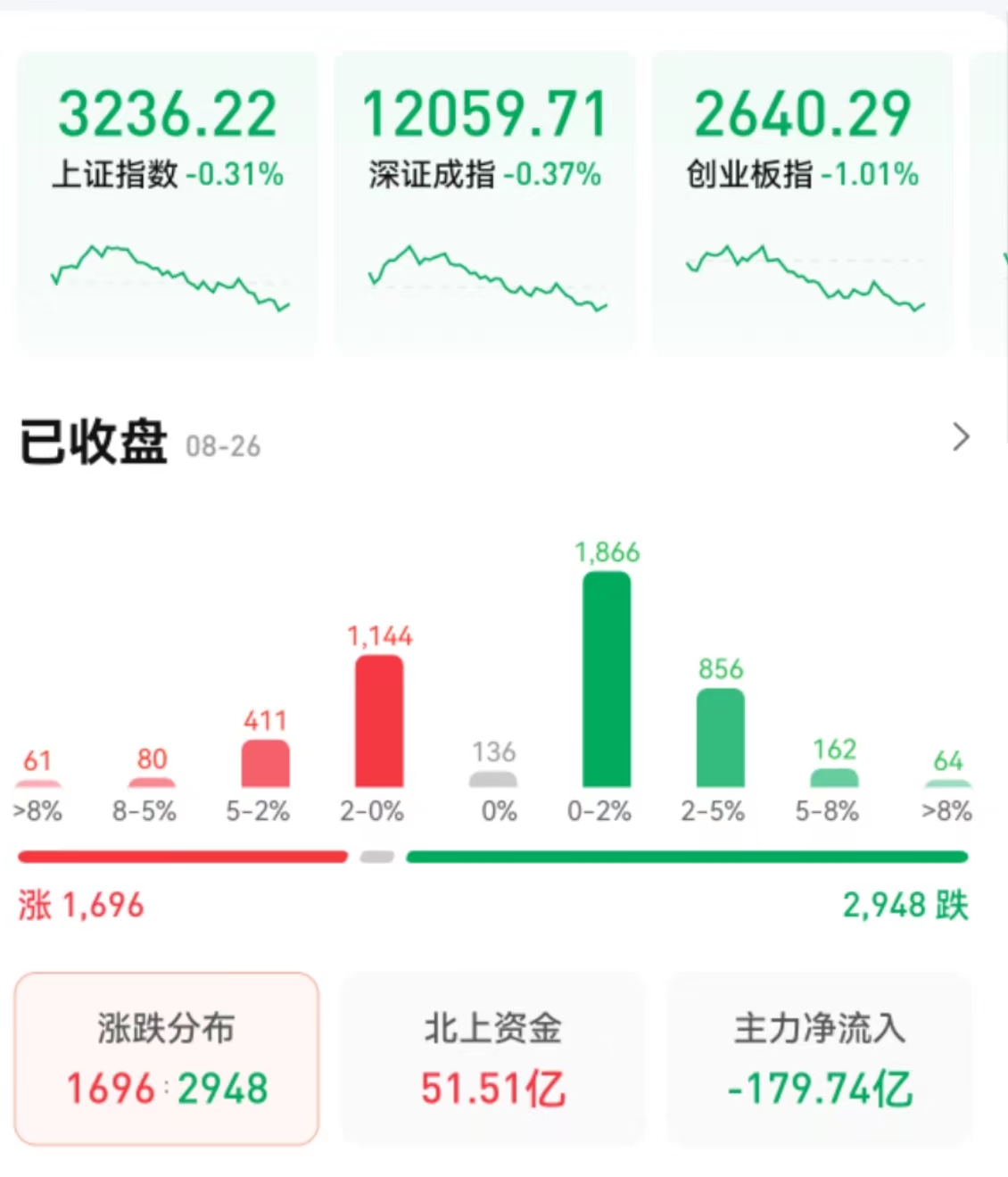 8月26日,A股三大指數(shù)集體收跌,截至收盤,上證指數(shù)跌0.31%報3236.22點,深證成指跌0.37%報12059.71點,創(chuàng)業(yè)板指跌1.01%報2640.29點;兩市合計成交9292億元,北向資金凈買入51.51億元。總體來看,A股個股跌多漲少?;仡櫛局苋笾笖?shù)的走勢來看,上證指數(shù)期間累計跌0.67%,深證成指期間累計跌2.42%,創(chuàng)業(yè)板指期間累計跌3.44%。