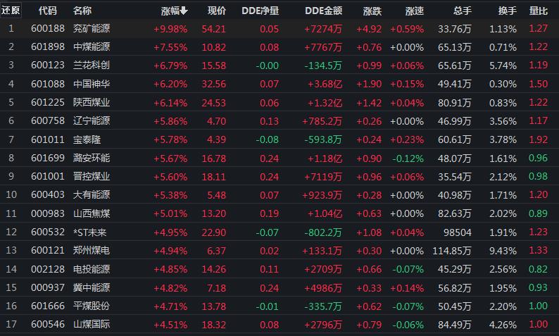 9月5日,煤炭行業(yè)漲幅居首達(dá)5.29%。其中,兗礦能源、中煤能源、蘭花科創(chuàng)、中國神華、陜西煤業(yè)等個(gè)股漲幅居前,均超6%。