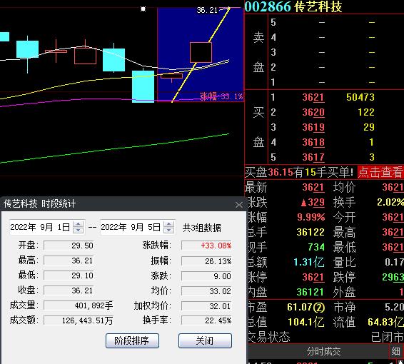 9月5日,熱門股傳藝科技再度漲停,截至收盤,報(bào)36.21元,實(shí)現(xiàn)3連板,累計(jì)漲幅達(dá)33.08%。
