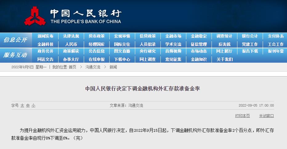 值得關(guān)注的是,今日收盤后,央行公布,下調(diào)金融機(jī)構(gòu)外匯存款準(zhǔn)備金率2個(gè)百分點(diǎn)。為提升金融機(jī)構(gòu)外匯資金運(yùn)用能力,中國人民銀行決定,自2022年9月15日起,下調(diào)金融機(jī)構(gòu)外匯存款準(zhǔn)備金率2個(gè)百分點(diǎn),即外匯存款準(zhǔn)備金率由現(xiàn)行8%下調(diào)至6%。