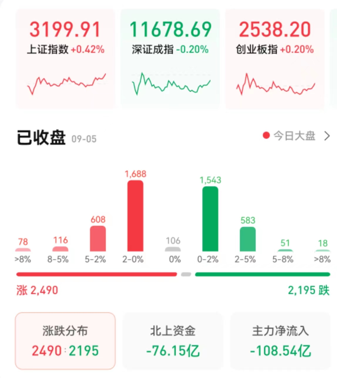 9月5日,A股三大指數(shù)震蕩分化,漲跌不一。截至收盤,上證指數(shù)漲幅達(dá)0.42%報(bào)3199.91點(diǎn),深證成指跌0.2%報(bào)11678.69點(diǎn),創(chuàng)業(yè)板指漲0.2%報(bào)2538.2點(diǎn);兩市合計(jì)成交7697億元,北向資金凈賣出76.15億元。總體來看,A股個(gè)股漲多跌少。