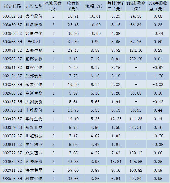 具體來看,農(nóng)林牧漁行業(yè)96只交易個股中,有86只上漲,占比89.58%,其中,有4只個股漲停,12只個股漲幅超5%。