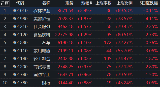 從申萬一級行業(yè)看,31類行業(yè)中有19類上漲,占比61.29%,其中,農(nóng)林牧漁行業(yè)漲幅居前,達2.49%,此外,美容護理和社會服務(wù)漲幅居二三位,分別達1.87%和1.57%;跌幅最大的是房地產(chǎn),跌幅為2%。