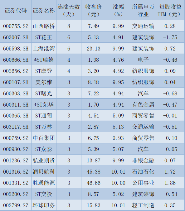 表:連續(xù)上漲3天且今日收盤漲停股一覽