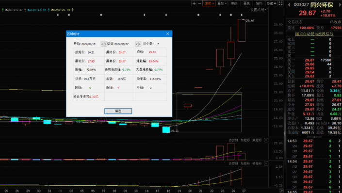 9月27日,同興環(huán)保漲10.01%,報29.67元。該股自9月19日以來,截至9月27日已連續(xù)7個交易日上漲,累計漲幅達83.04%,其中6個交易日漲停價報收。該股最新A股總市值達39.29億元,A股流通市值19.58億元。