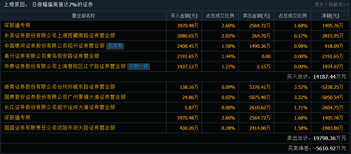 據(jù)同花順機構(gòu)成功率回測顯示,深股通專用買入3970.48萬元,該營業(yè)部買入后,次日上漲概率50%,平均盈利0.31%。收益率最高的是持股1天后賣出,收益率0.31%,成功率50%。東吳證券股份有限公司上海西藏南路證券營業(yè)部買入3080.65萬元,該營業(yè)部買入后,次日上漲概率36%,平均盈利-1.36%。收益率最高的是持股1天后賣出,收益率-1.36%,成功率36%。