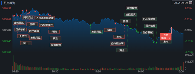 截至9月29日收盤,上證指數(shù)跌0.13%,收報3041.20點,深證成指漲0.18%,收報10919.44點,創(chuàng)業(yè)板指漲0.83%,收報2333.00點;滬深兩市合計成交額6245.7億元,較前一交易日縮減3.50%;北向資金凈買入34.29億元;總體來看,A股中上漲個股為1638只,下跌個股3173只。