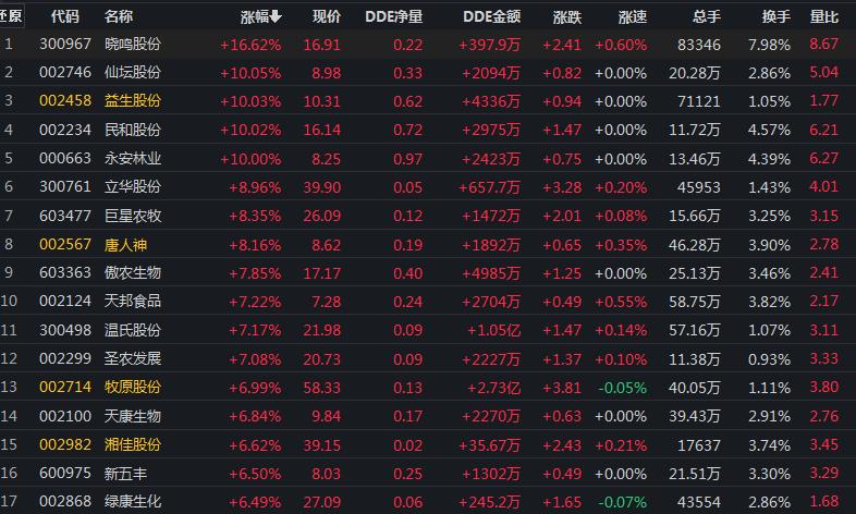 具體看,截至10月10日上午收盤,農(nóng)林牧漁行業(yè)漲幅居首,達(dá)4.29%。其中,仙壇股份、益生股份、民和股份和永安林業(yè)等4只農(nóng)業(yè)股集體漲停。