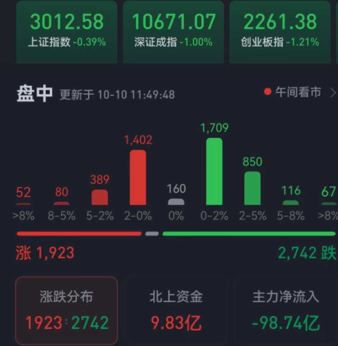 國慶節(jié)后首個交易日,周一(10月10日),三大股指震蕩回落,全線飄綠。截至上午收盤,上證指數(shù)跌幅達(dá)0.39%,報3012.58點(diǎn);深證成指和創(chuàng)業(yè)板指跌幅分別為1%和1.21%;滬深兩市合計(jì)成交額3899.8億元,總體來看,兩市個股跌多漲少。