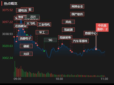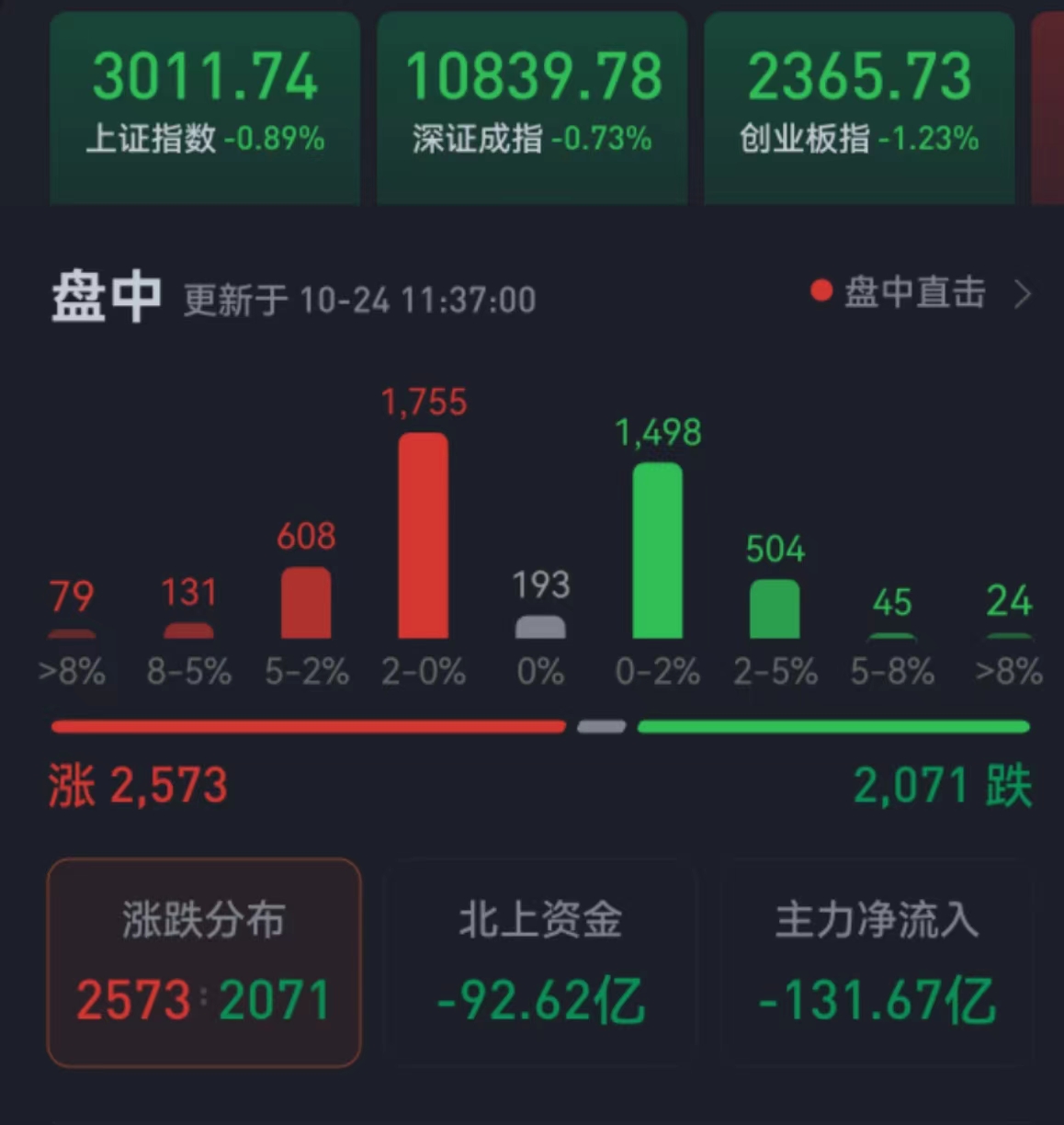 周一(10月24日),三大股指震蕩回落,全線收陰。截至上午收盤,上證指數跌幅達0.89%,報3011.74點;深證成指和創(chuàng)業(yè)板指跌幅分別為0.73%和1.23%;滬深兩市合計成交額5377.6億元,總體來看,兩市個股漲多跌少。