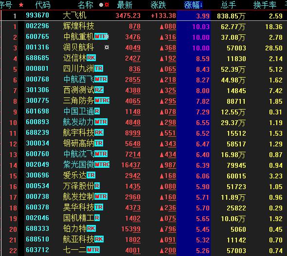 具體看,截至10月24日上午收盤,大飛機板塊起飛逆市飆升,漲幅居首達3.99%。其中,輝煌科技、中航重機和潤貝航科等3只概念股集體漲停。
