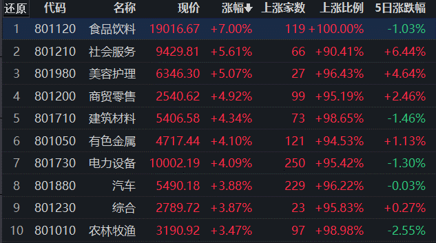 31類申萬一級(jí)行業(yè)中,有30類上漲,占比96.77%,其中,食品飲料漲7%,居首;下跌方面,僅國防軍工行業(yè)下跌,跌幅0.54%。