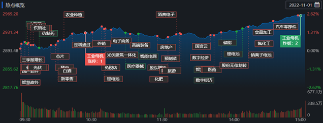 截至11月1日收盤,上證指數(shù)漲2.62%,收?qǐng)?bào)2967.20點(diǎn),深證成指漲3.24%,收?qǐng)?bào)10734.25點(diǎn),創(chuàng)業(yè)板指漲3.20%,收?qǐng)?bào)2337.65點(diǎn);滬深兩市合計(jì)成交額9775.5億元;北向資金凈買入61.55億元;總體來看,A股中上漲個(gè)股4348只,下跌個(gè)股470只。