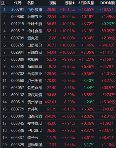 申萬一級(jí)行業(yè)中食品飲料行業(yè)領(lǐng)漲,漲幅達(dá)7.00%,獲得43億元大單資金的凈流入,居第一位。行業(yè)119只交易中的個(gè)股全線上漲,其中,51只個(gè)股漲幅超5%。