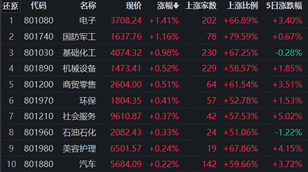 31類申萬一級行業(yè)中,有11類上漲,占比35.48%,其中,電子漲幅達1.41%,居首;下跌方面,計算機行業(yè)跌幅居首,達2.05%。