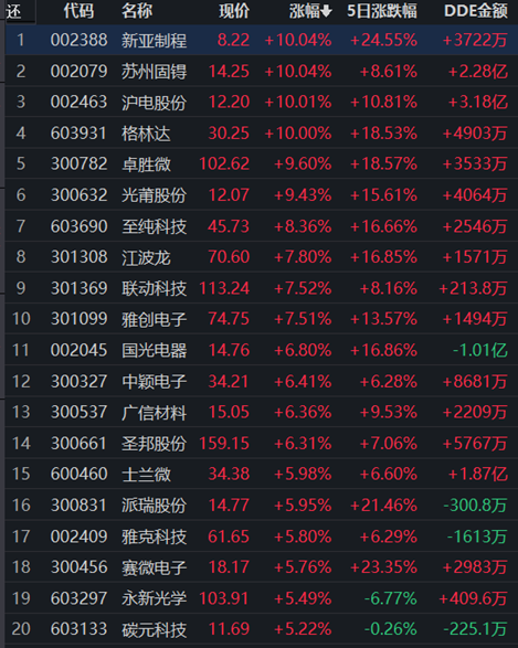 具體來看,電子行業(yè)領(lǐng)漲,獲得3.10億元大單資金的凈流入,居第三位。行業(yè)301只交易中的個股,有202只上漲,占比67.11%,其中,21只個股漲幅超5%。