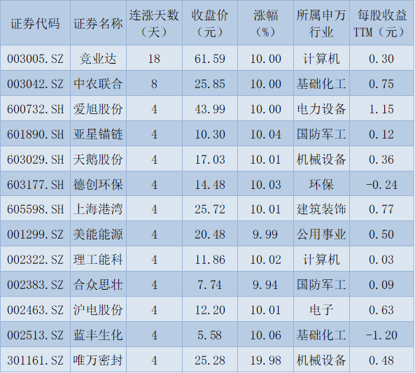 表:連續(xù)上漲4天且今日收盤漲停股一覽