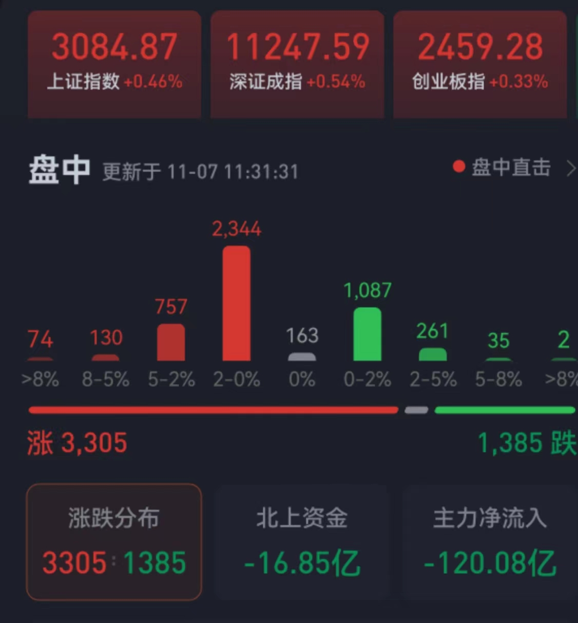 周一(11月7日),A股三大指數(shù)震蕩攀升,全線飄紅。截至上午收盤,上證指數(shù)漲幅達(dá)0.46%,報(bào)3084.87點(diǎn);深證成指和創(chuàng)業(yè)板指漲幅分別為0.54%和0.33%;滬深兩市合計(jì)成交額6548.9億元,總體來看,兩市個(gè)股漲多跌少。